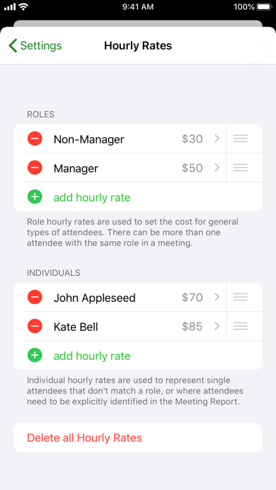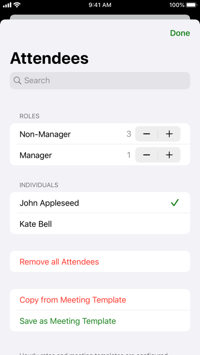 How much time and money is being spent in meetings? Meeting Cost Timers displays the meeting duration, total person hours, and total cost (based on the hourly rates for attendees). Visualizing this information can help focus meetings to save time and money. • Configurable hourly rates for roles and individuals (using your local or custom currency). • Add or remove attendees during the meeting. Person time and cost calculations are adjusted accordingly. • Pause and restart the timer for those really long meetings that require breaks. • Use meeting templates to quickly configure the attendees for recurring meetings. • Meeting templates appear in iOS search results. Tap a result to automatically launch the app and change the current attendees. • Siri shortcut support for copying attendees from meeting templates (requires iOS 12). • Manage shortcuts in the app's Settings screen, the Shortcuts app on iOS 13, or in the Siri & Search section of Apple's Settings app. • Back up your currency, hourly rates, meeting templates and current meeting configuration to iCloud, Dropbox etc. for safekeeping or to copy between your devices. • Change icon currency symbol. • Inverted colour scheme is great for projecting onto the wall. • Generate a report of the meeting's current elapsed time, cost and attendees. • External display support showing a custom screen-filling view of the timer. • VoiceOver support for the visually impaired. • Dark appearance support (requires iOS 13). • iPad multitasking. Meeting Cost Timers is available for iOS and Mac. It is free to download and use with some restrictions. A single in-app purchase unlocks all features on both platforms: • Back up and restore your data. • Unlimited number of attendees. • Unlimited number of hourly rates. • Unlimited number of meeting templates. • Change icon currency symbol (iOS only). For more information see https://hacknicity.com/meetingcosttimers or email me at support@hacknicity.com