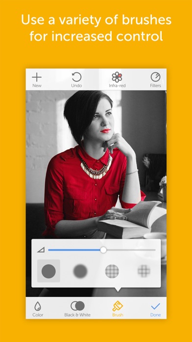 Make colors jump out of your photo with Splash of Color! Convert your photos to black and white while keeping certain details in color. Give your photos a dramatic look. Simple and easy to use. Choose a photo from your library or take a new one with your camera. Draw back the color with precision. Many different brush sizes and styles. Use your finger as a brush to add back color or erase it. Choose a color filter for more creativity with Splash of Color Pro. Undo any mistakes with the tap of a button. Share your Splash of Color creation on Instagram.