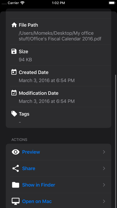 Find It is all you need to easily search, view, download, and share files from your Mac directly to your iPhone or iPad. Easily connect with your Mac with "Find It Server" and follow instructions to search files on your iPhone or iPad. To connect Find It with your Mac, you need to install "Find It Server". Download server application for FREE : http://bit.ly/finditserver • Spotlight on your Pocket: Search your Mac directly on iPhone or iPad • Documents' Information: View general information like Size, Created/Modified dates, tags, and file path. • Quick Look: Open and preview the most common formats. •More Options: Open files with Mac, Show in Finder or share files with other iOS apps. • Find It Premium: Upgrade to Premium Version to search without limitations. - Important Note: Both iOS and Mac apps must connect to the same and local Wi-Fi network, you cannot use this app remotely from other locations.