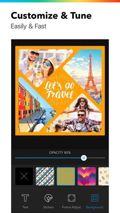 The easiest pic collage app! Choose from tons of trendy template designs and photo collage styles to TELL YOUR STORY with one framed picture! Hundreds of awesome effects, stickers, frames, backgrounds, patterns, and text labels! Get creative, come up with some neat stuff or make your photos extra funny-sassy-sweet special! Edit and touch up your pics with powerful editing tools, photo effects, beauty & body retouch essentials! FEATURES • 300+ Collage Layouts in different shapes, sizes, styles! Mix-match your pics, rotate, move and set them up just about any way you like! • Super easy, super flexible, super fun! Just pick a layout and put your photos in! • Combine from 2 to 25 favorite shots into a single pic in the quickest and most artful ways! • 100+ Beautiful Frames: set a style, choose any color, resize grids, reshape borders and experiment as you want! • 400+ Stickers & Decorations! Create some art, personalize your collages and add extra bright fun to suit your own style! • 100+ Pro Filters to create a whole different photo mood or give that professional touch! • 50+ Quick-Fix Beauty Filters: enhance your natural beauty and look your flawless best! • Instant Beauty Retouch Tools: smooth out your skin, enhance eyes, reshape face, fix any flaws and do so much more for your perfect portrait look! • 200+ Body Filters & Stickers: retouch your body, add tattoos and 6-pack abs for a fit, hot & all-new body look! • 80+ Backgrounds: easily choose & change any color, opacity and background style pattern! • 60+ Overlay-Textures to finish it off and add more artistic flare! • Add ‘uniquely yours’ words & text art: choose from 100+ handpicked fonts, switch sizes and colors! • Everything-Awesome & Powerful Photo Editor: tweak & tune any detail, add even more special touches and make your creative juices flow with a bunch of photo enhancement tools! ***Premium Subscription*** As a member of Collageable Premium, you enjoy unlimited access to our huge exclusive set of Pro-Level Features & Amazing Members-Only Benefits, with no limits! Enjoy professional portrait & beauty tools, 800+ collage layouts & effects, filters, body makeover essentials and more! New сonstant additions! -2 subscription options: annual (12-months, $2.99 USD per month, full pre-payment), monthly ($3.99 USD, 7-day free trial). -By subscribing you get unlimited access to all the app’s functionality for the whole duration of your subscription period. -Payment will be charged to iTunes Account at confirmation of purchase. -Subscription automatically renews unless auto-renew is turned off at least 24-hours before the end of the current period. -Account will be charged for renewal within 24-hours prior to the end of the current period. “Free trial” > $3.99/month, or renewal equals to the initial subscription chosen and its current price unless a special price is offered. -You can cancel a free trial, manage your subscription and turn off the auto-renewal anytime through your Account Settings. This must be done 24 hours before the end of a free trial or subscription period to avoid being charged. -Privacy Policy: http://collageable.com/terms.html -Terms of Use: http://collageable.com/privacy-policy.html -As soon as you purchase a subscription, any unused part or time-span of a free trial period will be forfeited. We’d love to hear from YOU! Drop us a line at support@filterra.net ~Your Collageable Team