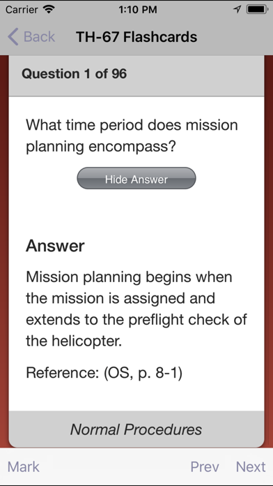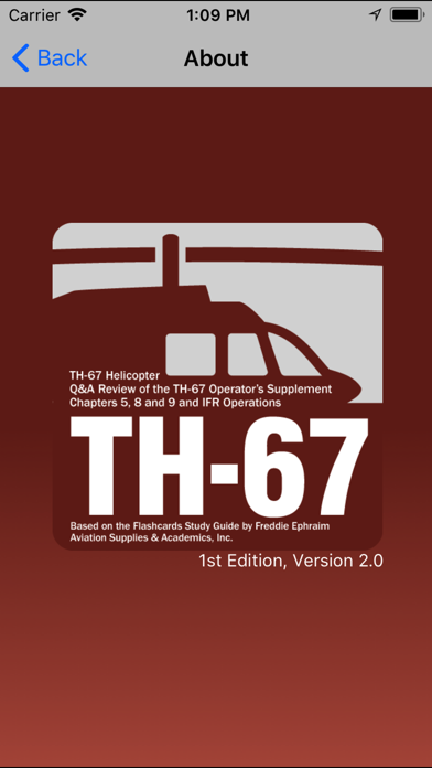 ASA’s TH-67 Helicopter Flashcards is a must have for Army flight school students as well as anyone learning to fly in the TH-67 model. Designed to facilitate memorization and deepen understanding of safe and effective helicopter operations, these flashcards help both civilian and military pilots master the aircraft. They’re not only useful to pilots preparing for their checkride, but also instructors looking for a thorough review to ensure currency and increase safety. Four hundred flashcards cover nearly all the material in Chapters 5, 8, and 9 of the TH-67 Operator’s Supplement and FAA/Army helicopter instrument procedures. Topics include operating limitations and restrictions, normal and emergency procedures, as well as Army IFR content for instrument/advanced students. Each flashcard identifies the chapter in the Operator’s Supplement from which the question was derived. The question is first presented alone, with a simple tap to see the answer. Questions reflect the information pertinent to safe operations in the TH-67 Helicopter. The answers include references to specific materials useful for further study: • AIM - Aeronautical Information Manual • AR95-1 - Aviation Flight Regulations (Department of the Army) • FIH - Flight Information Handbook • FLIP - DOD/U.S. government Flight Information Publications • FM - Flight Manual 03-04.240 • FTG - Flight Training Guide • GP - General Planning (DOD Flight Information Publication) • IFRS - IFR Supplement • OS - TH-67 Operator's Supplement Flashcards reflect the content of the TH-67 Operator's Supplement Compatible with iOS devices, the App features: • No internet connection required; app fully installs to your device. • 400 questions most frequently asked during a TH-67 helicopter checkout, supported with succinct, ready responses. • Ability to Mark questions from any subject to review collectively as a custom study session • Includes all the questions and answers from the TH-67 Helicopter Flashcards Study Guide by Freddie Ephraim. • Brought to you by a trusted resource in aviation training and publishing, Aviation Supplies & Academics (ASA).