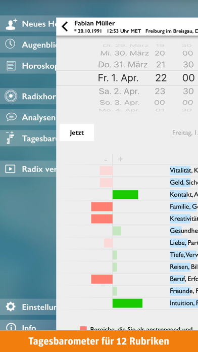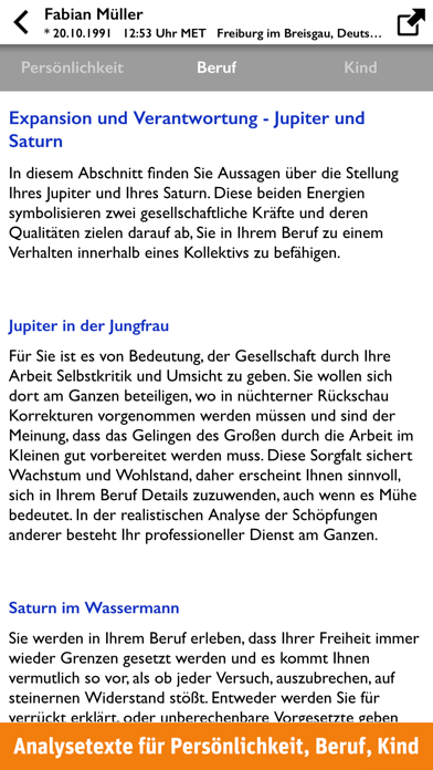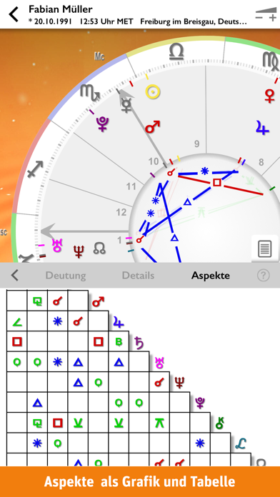 Wie stehen Ihre Sterne? Erstellen Sie in Sekundenschnelle professionelle individuelle Horoskope für sich selbst oder für Familie und Freunde. Detaillierte Analysetexte verraten Ihnen, welchen Einfluss Ihr Geburtshoroskop auf Ihre Persönlichkeit sowie auf Beruf und Karriere hat. Mit dem Tagesbarometer finden Sie heraus, wie Ihre persönlichen Sterne am heutigen Tag stehen. Die professionelle Astrologie-App mit folgenden Funktionen: • Horoskope mit Radix-Grafik, übersichtlicher Detailinformation und Aspektarium • Kurzdeutungen und Informationen direkt über die interaktive Radix abrufbar • Individuelle Analysetexte zu Persönlichkeit, Kind und Beruf • Tagesbarometer mit Kurzanalyse zu zwölf Themen wie Gesundheit, Familie, Liebe, Beruf, Geld, Kreativität oder Freundschaft • Analysetexte als PDF-Datei exportieren oder drucken (AirPrint) • Aspekte-Zoom zur übersichtlichen Darstellung der gewichteten Aspekte • Ortssuche per Eingabefeld oder Geo-Kartendienst • Umfangreiche Ortsdatenbank mit 180.000 Einträgen inklusive Zeitzone und automatischer Berechnung von Sommer- und Winterzeit • Anzeige der Postleitzahlen für Orte in Deutschland, Österreich und der Schweiz • Beliebig viele Horoskope unbegrenzt speichern, löschen und nachträglich bearbeiten Für den leichten Einstieg: • Einführungsvideo zu Aufbau und Deutung eines Geburtshoroskops (Laufzeit 13 Minuten) • Erklärungen für Astrologie-Einsteiger in den Analysetexten, z. B. Was bedeutet der Mond im Horoskop? Wie beeinflussen die Sterne Ihren beruflichen Erfolg? Horoskopdetails: • Deutung aller Planeten, Häuser und Tierkreiszeichen inkl. Aszendent und Medium Coeli • Enthaltene Aspekte: Konjunktion, Opposition, Quadrat, Trigon, Sextil, Quincunx, Halbsextil, Halbquadrat, Sesquiquadrat, Quintil, Biquintil • Mit den Sensitivpunkten Chiron, Lilith und aufst. Mondknoten • Anzeige der Rhythmen (kardinal, fix, beweglich), Qualitäten (männlich, weiblich) sowie der Elemente (Feuer, Erde, Luft, Wasser) • Wählbare Häusersysteme: Placidus, Koch, Porphyrius, Regiomontanus, Campanus Berechnung des Geburtsherrschers: • Exakte astronomische Berechnung der Signaturen • Anzeige aller zum Geburtszeitpunkt nahestehenden Himmelskörper mit Hinweisen auf Erhöhung und Fall • Detaillierte Beschreibungen der sieben Geburtsherrscher mit Fokus auf deren medizinische Charakteristika sowie die empfohlenen Vorbeugungs- und Therapiemittel • In Zusammenarbeit mit Dr. Michaela Dane, Biochemikerin und Homöopathin ***** Verbesserungsvorschläge, Featurewünsche oder Fragen? Wir freuen uns auf Ihre Anregungen! Mail an: ios@usm.de Updates und Neuigkeiten auf www.usm.de oder bei facebook.com/USM.Verlag und twitter.com/USM_Info *****