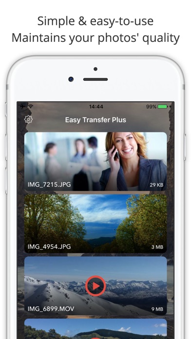 "Simple to setup & use, instant connection, no messing around with random software on the PC, just tap & go." - Joanne Thorpe "Blisteringly fast & easy, transferred a 500mb video in 30 seconds!" - Terry Isaac "This app makes my life so much easier! I use it everyday to transfer photos from my camera for Instagram." - Geoff Frost Easy Transfer does exactly what it says on the tin: Makes it easy to transfer photos and videos between your computer, iPhone & iPad. No need for cables or software on your computer. Simply open up a web browser and upload & download to your heart's content. Because Easy Transfer makes use of your local network, transfers are extremely fast. Much faster than if the file had to be uploaded to and downloaded from the internet before arriving on your device (e.g. Emailing to yourself, or using a service like Dropbox). Features: • Fast, 100% secure & easy-to-use • Send multiple photos and videos as the same time • Photos & videos are transferred with full resolution & no loss of quality • No limit on the size of photos/videos you can transfer • Supports background transfers: Start transferring a large file, then do something else with your phone or computer while you wait for it to complete • Works on Windows, Mac or Linux Easy Transfer does not use or save your files to any external server. It provides a completely private website that can only be accessed by computers that are directly connected to your local network. Your photos and videos cannot be accessed from the Internet.