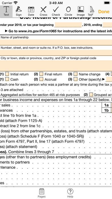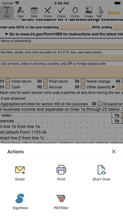Complete, send and print 1065 forms quickly and easily on your iOS device The 1065 form application allows you to fill out the U.S. Return of Partnership Income for free without additional software and time-consuming registration right on your iOS device. Choose the version of the 1065 form you need and start completing it on the spot. Every year more than 300,000 tax returns are filed with the help of PDFfiller. The easy-to-use PDFfiller editing tools help you add all required information and modify the document according to your needs. Save your time and go paperless with PDFfiller. Key features: - type text anywhere on the form and edit it whenever you need to - navigate between fillable fields using the arrows on the top of the screen - date the form automatically - add custom graphics including checkmarks, images, lines, arrows, etc. - draw a digital legally binding signature using your fingertip or stylus - email the completed form or print it right from your iOS device