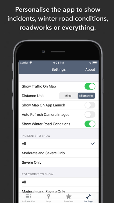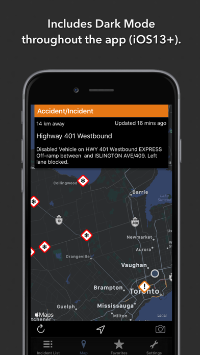 Live traffic reports and cameras for Ontario including Toronto and Ottowa. Save your favorite cameras for quick access. The January 2020 release includes winter road conditions and a new dark mode. KEY FEATURES: Live data from The Ontario Ministry of Transportation: - 362 traffic cameras covering Ontario. - 191 traffic cameras covering Toronto. - Today screen widget to show at a glance the nearest current traffic incidents. - Dark Mode throughout the app (iOS13+). - Optimised for all iPhone and iPad models. MAP VIEW - Shows current incidents, roadworks, winter road conditions and traffic cams - Each incident is color coded as well as being represented by an icon showing the incident type. - Clicking on an incident displays more detail right there on the map. - The map view can also show live traffic camera images. LIST VIEW - Shows current incidents in order of distance from your current location (closest incidents are shown first). - Each incident is color-coded to indicate the severity of the delay. - You can quickly see the distance the incident is from you, the road name and the type of incident. - The detail view shows the description together with a map showing the location. - Full search functionality, works across both the list and map views. TRAFFIC CAM FAVORITES - Save your favorite cameras for quick access to see how clear/congested your usual routes are. TODAY WIDGET - Shows at a glance the nearest current traffic incidents without launching the app. PERSONALISE - Toggle traffic information on the map. - Toggle auto refresh of camera images (will refresh every 10 seconds). - Toggle always show map on app launch. - Toggle winter road conditions. - You can configure which incidents are displayed according to the severity of the delay caused. - Kilometres or Miles setting. CONTACT - Email me for feature requests/bug reports etc. I would love to hear from you! Data courtesy of The Ontario Ministry of Transportation.