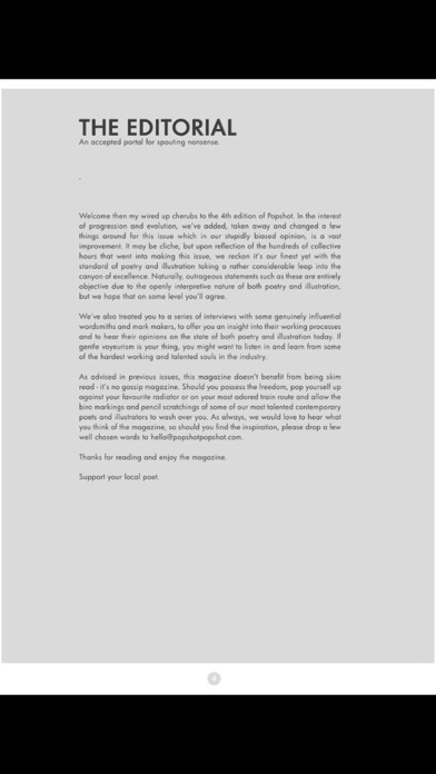 Popshot is an illustrated literary magazine that publishes short stories, flash fiction, and poetry from the literary new blood. Future issues are also available through the following auto-renewing subscription(s): -12 Issue (1 Year) at £19.99 -6 Issues (6 Months) at £9.99 The subscription will include the current issue if you do not already own it and subsequently published future issues. Payment will be charged to your iTunes Account at confirmation of purchase. This subscription will automatically renew unless auto-renew is turned off at least 24-hours before the end of the current period, your account will be charged for renewal within 24-hours prior to the end of the current period. The cost of the renewal will match the initial subscription price. You may turn off auto-renewing subscriptions by going to your user’s Account Settings after purchase. No cancellation of the current subscription is allowed during your active subscription period. For support, please visit http://www.apazine.com/support/