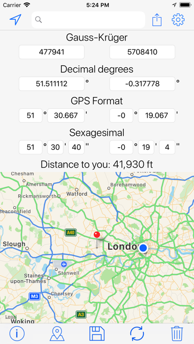 Gauss-Krüger Coordinates Tool is a great tool to convert your coordinates into different formats. You can convert your coordinates into 4 formats: - Gauss-Krüger - Decimal degrees (DDD.DDDDDD°) - GPS Format (DDD° MM.MMM′) - Sexagesimal (DDD° MM′ SS″) Extra functions: - You can locate yourself and convert these coordinates. - You can set a pin or move a pin and it shows you the coordinates of the pin. - You can see the distance between you and the coordinates or between you and the pin. - You can search for locations. - You can share and send your coordinates. - You can display the coordinates (or your location) on the maps app. - You can save and load coordinates to use them later. - You can hide the map to save battery and mobile data.
