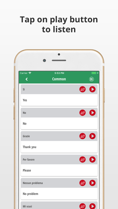 Learn Italian Language app for Italian language learning quickly! Tired of the traditional approach to learning a new language? If you have been looking for an efficient app to learn and speak Italian, then look no further! We offer you the best app for Italian learning with English to Italian translation wherein you can learn Italian language phrases and start speaking Italian like a native. Whether you want to visit Italy for fun or work, this is the best Italian learning and Italian translator app for you. You will see that not everyone will be speaking English there. It will come in handy if you are able to communicate with people in Italian. Communication skills With this app, learn Italian and learn to communicate effectively. All the phrases and expressions in the app are based on the real-life situations rather than a collection of out of the context and impractical words and phrases. Practice Listening and Speaking Skills The app contains not just written phrases, but it also has the audio pronunciation of each phrase. Hence, the app allows you to practice listening and speaking skills by dedicating only a few minutes every day. Free Italian Translator You might be thinking why we call this app a translator? It is a free translator as you can use it as a translator instead of a learning app whenever needed. It has a collection of useful phrases for every situation. Highlights of ‘Learn Italian Language’ app: • Simply, fun and easy to use • Beginner-friendly, no prior knowledge is required • Categorized phrases with English to Italian translation • Clear cut pronunciation in the voice of a native speaker • Offline app, you don’t need internet to use the app • Free app, no registration or sign up is required To get the most out of this app, concentrate on one category every day. Within only a few days you will be able to speak Italian with confidence. Download ‘Learn Italian Language’ app on your iOS device now! ------------ If you like our app, then we would appreciate you giving us five stars in the App Store. Your feedback is also valuable to us, so write a review when rating us. You can share the app with your friends and family so that they can also benefit from this amazing app. Thank you for downloading and using this app to learn Italian!