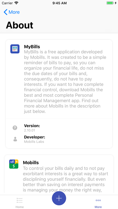 Never miss the payment day of your expenses! With MyBills you can easily manage all your bills and do not miss paying then before its due dates. With MyBills you can register your bills with a simple way, even this, its possible to manage all your recurring bills as monthly, semester and yearly. With this, MyBills will automatically reminds you before all your bills due dates. Besides that, you can list all your paid bills. MyBills features: - Manage all bills - Friendly notifications and reminders of your bills - Ease manage your pendings and overdues bills - Search to easily find an expense to pay - Paid bills history MyBills is a free application developed by Mobills. It was created to be a simple reminder of bills to pay, so you can organize your financial life, do not miss the due dates of your bills and, consequently, do not have to pay interests. If you want to have complete financial control, download Mobills the best and most complete Personal Financial Management app.