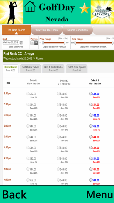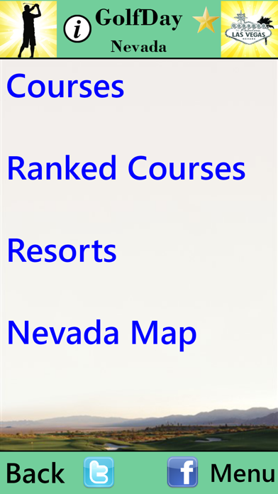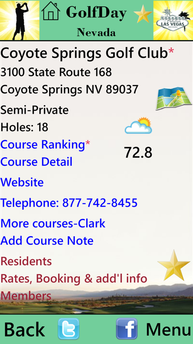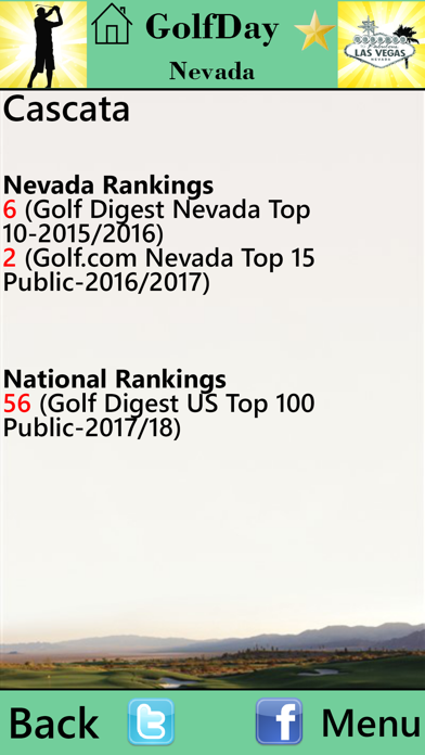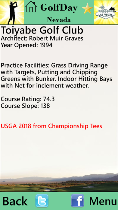 Price: $.99 ***NEVER ANY POP-UP ADS*** Golf Course Reference and Location Guide More than 100 golf courses in Nevada • Course Name and Address • Designation (Public/Private/Resort) • Course Rankings (Golf Digest/Golf.com/Golfweek/Dallas Morning News) • USGA Course and Slope Ratings • Course Architect(s) and Year Opened • Practice Facility Detail (Range-Grass or Mats, Targets, Short Game) • Booking links (Direct to on-line course site for best rates and availability without booking fees) • Link to Golf Course Web Site • Additional Links for Photos, Course Description, Layout, Score Card, Video and Specials (Public Courses) • Mapping and Directions to each course • Local weather conditions for each course • Member Login (Private and Semi-private courses) • Telephone Number (with auto-dial) • Course locator: Search by -GPS Proximity to where you are or where you are going -City or zip code -Course Ranking with proximity • Save Courses to “favorites” • Make Course Notes with auto email or text • Regular updates to keep your App current Start getting more course for your buck. GolfDay provides everything you need to find the course you want to play at the best rate--right at your fingertips. WHAT'S NEW More Courses, more rankings and more detail. The most accurate Golf Course information available.