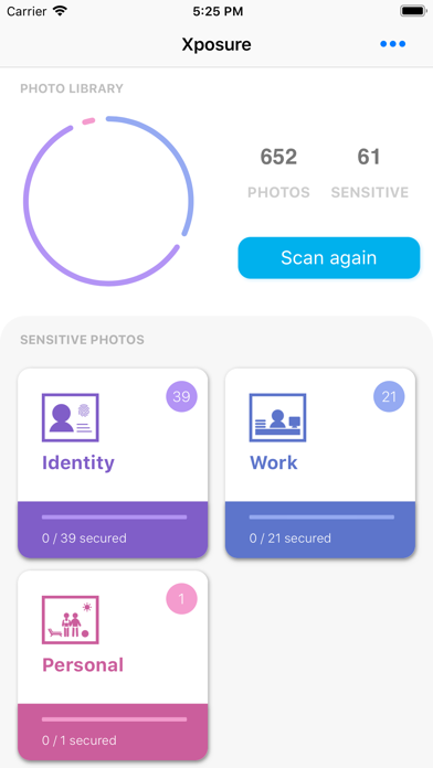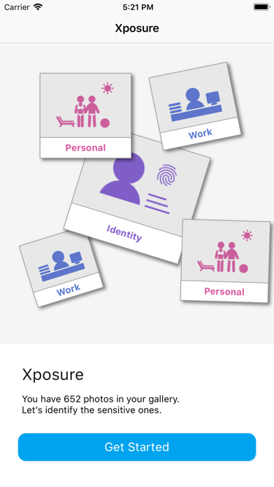 Xposure, by NortonLabs, uses artificial intelligence to scan and detect sensitive photos on your device. It broadly categorizes the photos as one of Identity, Work or Personal. Xposure helps you browse through photos on your device that may be sensitive, allowing you to take appropriate action on them, so that your privacy is protected. Features: - Photo scan driven by AI to identify sensitive content - Browse through photos categorized as Identity, Work or Personal - Preview or share identified images - Secure access to app using device lock mechanism (PIN / Password / TouchID / FaceID) Share your feedback with us by tapping on More Options (...) menu on app home screen and then, Feedback button, or email us at xposure_feedback@nortonlifelock.com