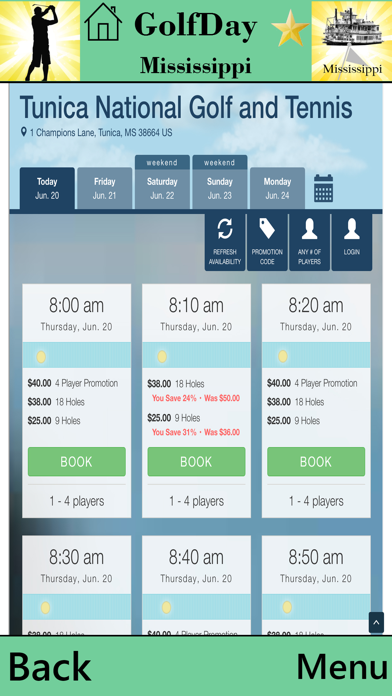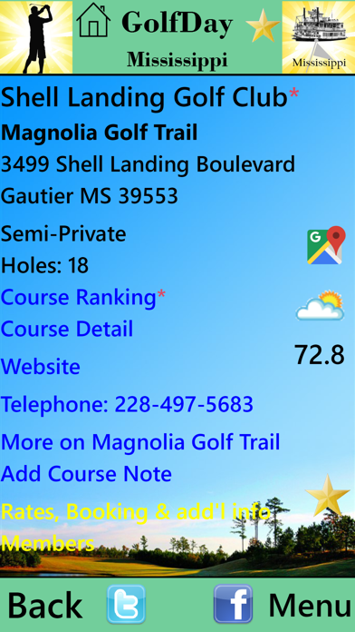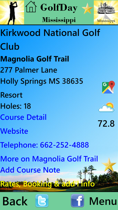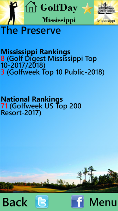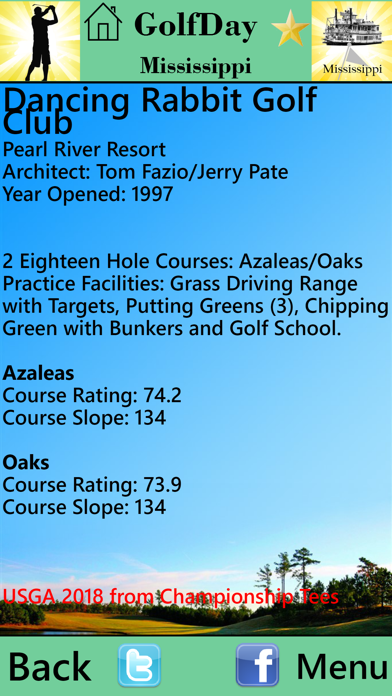 Price: $.99 ***NEVER ANY POP-UP ADS*** Golf Course Reference and Location Guide More than 100 golf courses in Mississippi • Course Name and Address • Designation (Public/Private/Resort) • Course Rankings (Golf Digest/Golf.com/Golfweek/Dallas Morning News) • USGA Course and Slope Ratings • Course Architect(s) and Year Opened • Practice Facility Detail (Range-Grass or Mats, Targets, Short Game) • Booking links (Direct to on-line course site for best rates and availability without booking fees) • Link to Golf Course Web Site • Additional Links for Photos, Course Description, Layout, Score Card, Video and Specials (Public Courses) • Mapping and Directions to each course • Local weather conditions for each course • Member Login (Private and Semi-private courses) • Telephone Number (with auto-dial) • Course locator: Search by -GPS Proximity to where you are or where you are going -City or zip code -Course Ranking with proximity • Save Courses to “favorites” • Make Course Notes with auto email or text • Regular updates to keep your App current Start getting more course for your buck. GolfDay provides everything you need to find the course you want to play at the best rate--right at your fingertips. WHAT'S NEW More Courses, more rankings and more detail. The most accurate Golf Course information available.