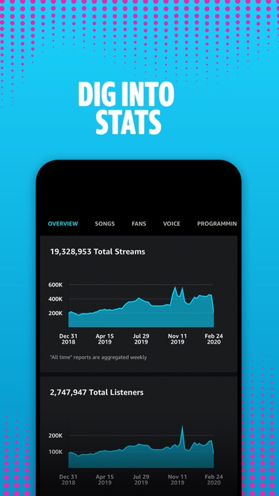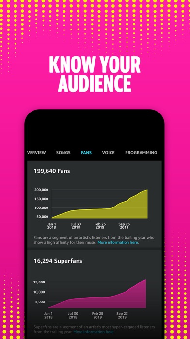 With Amazon Music for Artists, instantly know how your fans are listening to your music. Monitor trends or dive deep into the data. Be armed with the knowledge you need to take your marketing into its next phase. From the app you can: - View your music’s overall performance - Learn how you trend on Alexa with voice reporting and our Daily Voice Index - Find out where your listeners are with location insights - Discover a world of Fans and Superfans - Know where your songs are streaming across thousands of curated playlists and stations on Amazon Music. - Update your artist images - View real-time stats about your music’s performance and audience engagement - Connect your Twitch account and bring livestreams to more fans in the Amazon Music app More features coming soon! Once the app is downloaded, head to our artist website to learn everything you need to know about navigating to success on Amazon including opportunities, best practices, FAQs and more: https://artists.amazonmusic.com Follow us on Instagram: https://www.instagram.com/amazonmusicforartists