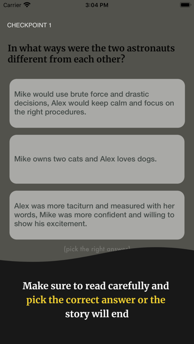 Read addictive stories with quizzes scattered along their plot. Answer correctly otherwise your story ends abruptly. Can you get to the end? StoryPick uses gorgeous illustrations and typography to immerse you into the story and allow you to enjoy each line of text. To make things even more fun and challenging, each story has a set of quizzes with the correct answer taken from the story itself. Make sure to read carefully if you want to finish it. StoryPick features: - addictive original stories - each story contains unique, gorgeous typography and illustrations - each story has quizzes to make things more fun and challenging - offline reading - the same tap for next lines of text format that you know and love - - - StoryPick is free to download and use. No online account or signup needed. For the Pro version we offer two subscription packages: $3.99/week (1 Week Subscription), $39.99/year (1 Year Subscription). All other features remain free to use indefinitely. These prices are for United States customers. Pricing in other countries may vary and actual charges may be converted to your local currency depending on the country of residence. Subscription service conditions: - Payment will be charged to your iTunes Account at confirmation of purchase - Your subscription automatically renews unless auto-renew is turned off at least 24-hours before the end of the current period - Your account will be charged for renewal within 24-hours prior to the end of the current period - You can manage your subscription and switch off auto-renewal by accessing your Account Settings after purchase - Refunds will not be provided for any unused portion of the term - Any unused portion of a free trial period, if offered, will be forfeited when the user purchases a subscription to that publication, where applicable - All personal data is handled under the terms and conditions of Bookly’s privacy policy. More details can be found here: http://storypick.app/privacy-policy/ http://storypick.app/terms-of-use/