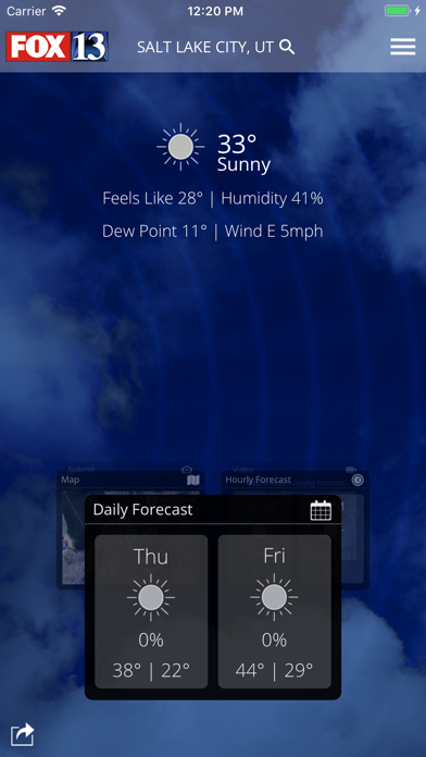 The FOX 13 Utah Weather App includes: • Access to station content specifically for our mobile users • 250 meter radar, the highest resolution available • High resolution satellite cloud imagery • Future radar to see where severe weather is headed • Current weather updated multiple times per hour • Ability to add and save your favorite locations • Daily and Hourly forecasts updated hourly from our computer models • A fully integrated GPS for current location awareness • Opt-in push alerts to keep you safe in severe weather • Severe weather alerts from the National Weather Service