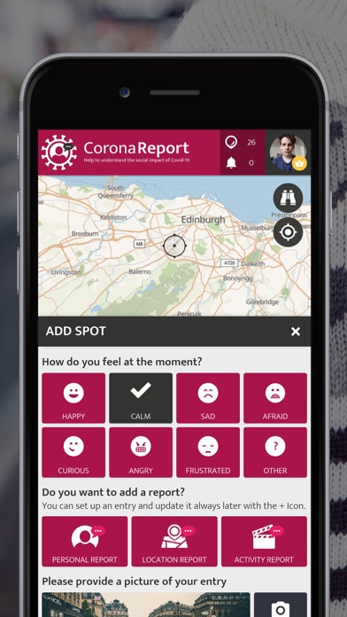 CoronaReport is a citizen science project developed by the Scottish Collaboration for Public Health Research and Policy (SCPHRP), and the University of Edinburgh. Citizens can record their experiences of the disease, and the effects on their lives. Please note: you can only contribute social science-related information in this app - it is not a medical tool nor does it offer any medical advice. Coronavirus (COVID-19) is the viral pandemic affecting communities worldwide. The pandemic’s impacts are varied and substantial. CoronaReport is a citizen science project which democratizes the reporting on the Coronavirus and makes these reports accessible to other citizens. You can create public reports about your experiences, including how the virus is affecting your area and the way your community functions (e.g., schools, nursing homes, and businesses). About the project The collected and anonymized data from the reports will then be shared on the CoronaReport platform enabling you and other citizens to see first-hand accounts about how people are feeling and experiencing the impact of coronavirus. You can choose how much information you want to contribute to your reports and if you want to connect with others to share experiences. By working together citizens can build a real-time and vivid picture of how coronavirus is influencing the way people live and work. For example, we do not know the extent to which countermeasures like social distancing are being practised and how this, and other countermeasures, are affecting people’s well-being. Find out more about the project on the website: www.coronareport.global The project is running on the SPOTTERON Citizen Science Platform.