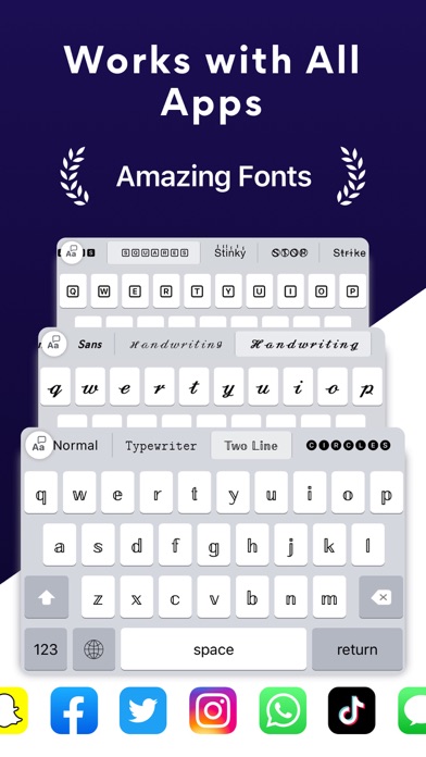 Would you like your Instagram posts and profile, Snaps, TikTok posts, WhatsApp messages to stand out from others? To impress your followers and friends you can use among variety of our exclusive fonts. Once you downloaded this font keyboard, you can use it with: • iMessage • Instagram • WhatsApp • Facebook • TikTok • Snapchat • Twitter • Telegram • Roblox and Many More Apps where you type anything! In-app purchases: -You can be a premium user through auto-renewing subscription per $9,99 monthly. - Payment will be charged to iTunes Account at confirmation of purchase - Subscription automatically renews unless auto-renew is turned off at least 24-hours before the end of the current period - Account will be charged for renewal within 24-hours prior to the end of the current period,and identify the cost of the renewal - Subscriptions may be managed by the user and auto-renewal may be turned off by going to the user's Account Settings after purchase - Any unused portion of a free trial period,if offered,will be forfeited when the user purchases a subscription to that publication,where applicable You can check terms of use: https://socem.com/TermsOfUse.html You can check privacy policy: http://socem.com/PrivacyPolicy.html