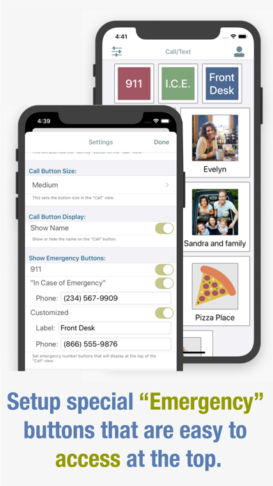 Connect to family and friends by adding their names and phone numbers so that you can call or text them by tapping their button. Add them via Contacts or by entering their name and phone number yourself. Add their photo to make their button easily identifiable or use one of the built in icons. Add your favorite pizza place or restaurant to quickly call for take-out or reservations. Set it up for your child or parent so they can easily call/text you when needed. Add emergency numbers that always appear at the top of the screen. ConnectEasy uses iPhone Accessibility features such as Dynamic Type and VoiceOver. ConnectEasy does not collect any user data or display ads.