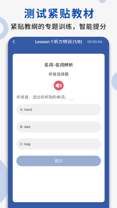 紧贴校内教学,智能辅助老师家长, 有效提高成绩,节省少年宝贵时间。 -------------------------------------- 【解决四大难题】 成绩不理想 口语不流利 学习走弯路 家长挺忙的 让孩子爱读敢说,成绩口语双提升! -------------------------------------- 【产品特色】 课本点读:同步教材、纯正发音、贴心翻译,可点读、连读、复读。 单词记忆:课文同步单词,单词评测,跟读、听写全面练习,记忆更有效。 口语训练:课文同步对话,角色扮演、智能评分、矫正发音,让孩子说一口流利的英语。 同步测试:多样化的课文同步测试,循序渐进、由浅入深,提升巩固综合知识。