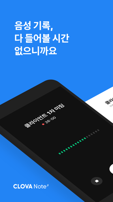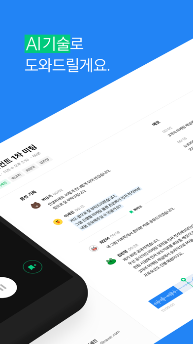“녹음은 잘 했는데, 언제 다 들어보죠?” 대화를 눈으로 보며 음성 기록을 찾아 들어보세요. #눈으로 보며 듣는 음성 기록 녹음이 종료되면 음성 기록이 텍스트로 자동 변환돼요. 텍스트로 변환된 음성 기록은 키워드로 검색할 수 있어요. #이거 누가 말했더라? 참석자의 목소리를 구분해서 음성 기록을 정리해줘요. 조용한 공간, 3인 이하의 참석자일 때 목소리 구분에 적합해요. #중요한 순간, 북마크 중요한 대화를 찾기 쉽도록 녹음 중에 미리 북마크 해두세요. 쉽게 찾고, 따로 모아 볼 수 있어 더 편리하죠. #음성 기록 정리가 쉬워지는 메모 녹음 중에도 PC에서 대화 주제나 아이디어를 메모해두세요. 메모는 언제든 작성하고, 수정할 수 있어요. #다양한 기기에서 효율적으로 클로바노트 앱과 PC는 자동으로 연동되어 사용할 수 있어요. 통화 기록처럼 따로 녹음한 음성 파일도 불러올 수 있어요. #알아두기 단, 녹음 기기와 음질, 네트워크 상태에 따라 정확한 음성 인식이 어려울 수 있으며, 텍스트 변환된 녹음 기록과 참석자의 목소리 구분 기능은 녹음 기록을 정리를 위한 초안으로서 활용하는 것을 권장합니다. 참, 녹음하기 전 참석자의 동의를 구하는 에티켓을 잊지 마세요!