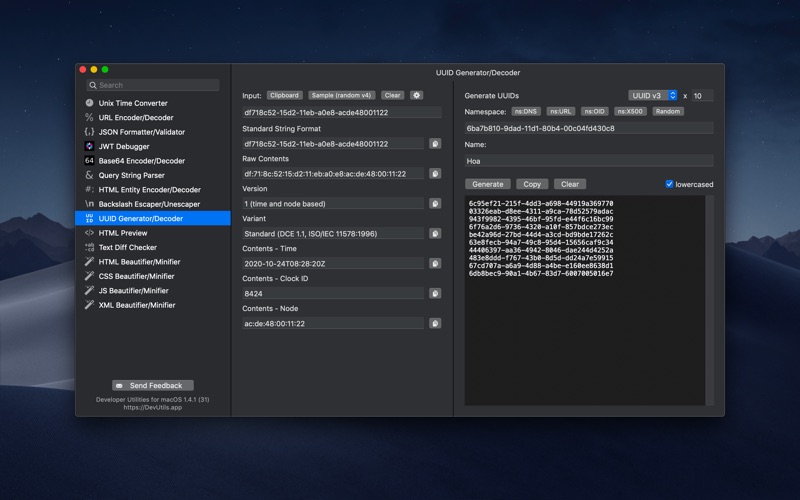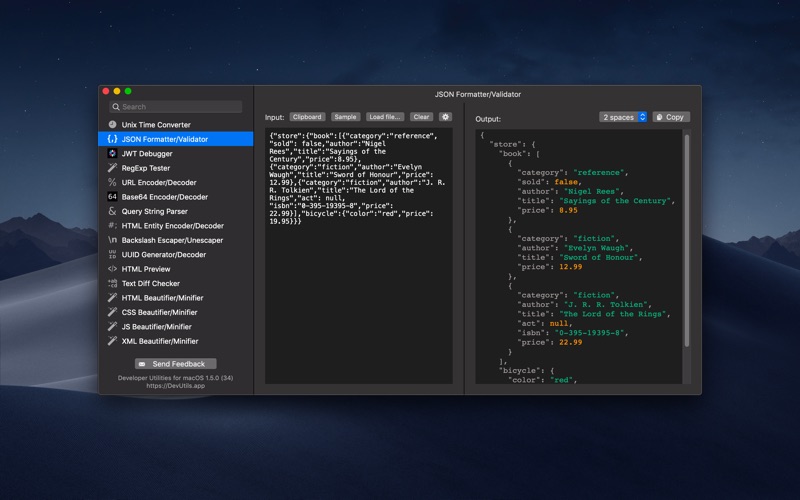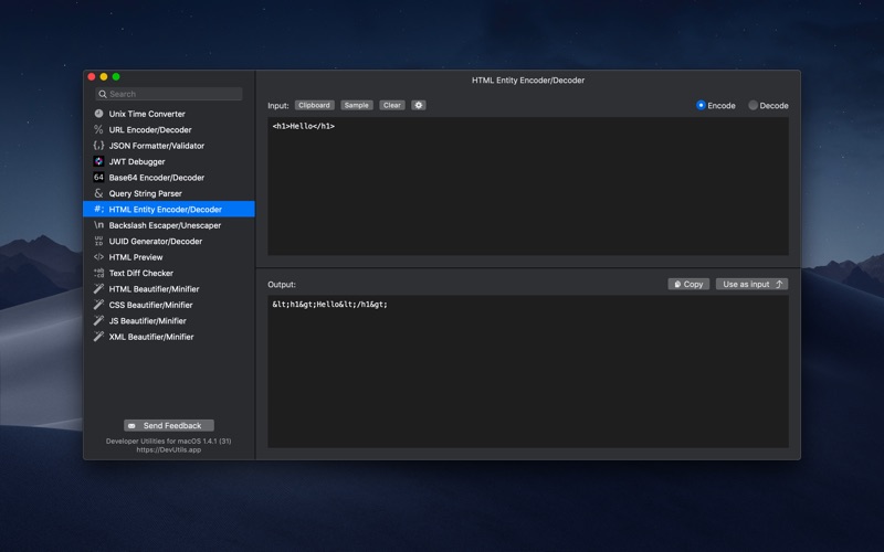 List of current tools: - Unix Time Converter - URL Encoder/Decoder - JSON Formatter/Validator - Number Base Converter - JSON to YAML - JAML to JSON - JWT Debugger - RegExp Tester - Base64 Encoder/Decoder - Query String Parser - HTML Entity Encoder/Decoder - Backslash Escaper/Unescaper - UUID Generator/Decoder - HTML Preview - Text Diff Checker - HTML Beautifier/Minifier - CSS Beautifier/Minifier - JS Beautifier/Minifier - XML Beautifier/Minifier - ...more are coming! ◆ Work Offline Stop pasting your JSON strings, JWT tokens, or any potentially sensitive data to random websites online. DevUtils.app helps you quickly do your tiny tasks entirely offline! Everything you paste into the app never leaves your machine. ◆ Smart detection DevUtils automatically selects the right tool based on your clipboard content. Activate the app anytime by: - Copy text ► Press ⌃⌥⌘Space (Or your own customized hotkey, up to you) - Copy text ► Click to the app icon in the status bar - Select text ► Right-click ► "Inspect in DevUtils.app" (This menu appears after you install the app) All options are configurable in the Preferences panel! ◆ Feature rich Many developer tools are supported, and more are coming. Scripting ability is coming soon so you can add your own tools/scripts. Suggest your favorite tools by dropping me an email at admin@devutils.app or send your own PR via GitHub.