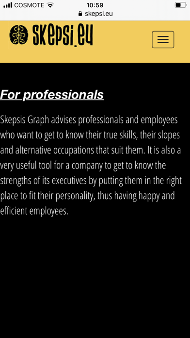 Skepsis Graph is a pioneering science-based Vocational Guidance system that explores one's personality, skills, inclinations, abilities, and interests and identifies the professions that suit each individual as well as their respective fields of study, exploring how making decisions through the domains of his brain. Skepsis Graph consists of 50 questions and usually takes a few minutes. Questions do not require any level of knowledge as you can see in 'Try it'. The results of the test, utilized, support and make career guidance more effective : • Make the right decisions about integrating the individual into the scientific fields, choosing directions and vocational education and training in new fields. • Check whether the practitioner or candidate is fit for the individual's actual abilities, skills, inclinations and personality. • Identify more individual inclinations and alternative career opportunities. • Determine whether the individual is able to meet the requirements arising from a particular work environment. • Identify the slopes, talents, abilities, and skills but also the personality traits of the individual and the level at which the individual holds them.
