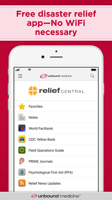 **Now includes Coronavirus (COVID-19) Outbreak Guidelines, an exclusive resource developed to help the health care community stay up-to-date with this rapidly changing infectious disease** Relief Central is a free mobile and web resource developed by staff and friends of Unbound Medicine. It includes the latest versions of The World Factbook from the CIA, CDC Health Information for International Travel (The Yellow Book), Coronavirus (COVID-19) Guidelines, the Field Operations Guide from USAID, Prime PubMed Search, and Relief News from the Red Cross, United Nations, US Centers for Disease Control, CDC, FEMA, and more. CORONAVIRUS (COVID-19) GUIDELINES Coronavirus Guidelines, updated regularly, includes the latest developments regarding this deadly virus (also known as 2019-nCoV; SARS-CoV-2) as well as an interactive Preparedness Checklist (CDC), Case Definitions, Clinical Syndromes, Infection Control, Lab Diagnosis, Treatment recommendations, and links to references/resources. THE WORLD FACTBOOK The World Factbook from the US Central Intelligence Agency (CIA) contains detailed information on the history, people, government, economy, geography, communications, transportation, military, and transnational issues for 266 world countries and territories. CDC YELLOW BOOK (Health Information for International Travel) The Yellow Book presents up-to-date advice on any travel health issue including vaccinations, essential trip planning and safety tips, prevention of an expanded list of travel-related infectious diseases, altitude illness, motion sickness, sunburn, medical tourism, and much more. USAID FIELD OPERATIONS GUIDE The Field Operations Guide from USAID delivers disaster assessment and response information and includes chapters and appendices ranging from information on populations at risk to commonly used acronyms, all arranged in an outline format. RELIEF NEWS Relief News puts the latest news at your fingertips with a collection of RSS feeds from trusted non-profit groups, international organizations, and government agencies. Feeds are from the Red Cross, United Nations, US Centers for Disease Control and Prevention (CDC), US Federal Emergency Management Agency (FEMA), ReliefWeb, and more. Prime PubMed Search Prime provides citations and abstracts from the latest issues of trusted disaster relief journals. Link to the fully-integrated Prime service where you can find related articles and view full-text articles provided by the journal publisher. FEATURES: • Cross Links for fast navigation between resources • Personalized favorites • Highlight and note-taking • Citations and abstracts from disaster journals • Advanced Search helps to find topics fast • Recently Viewed Unbound Privacy Policy: www.unboundmedicine.com/privacy Unbound Terms of Use: https://www.unboundmedicine.com/end_user_license_agreement