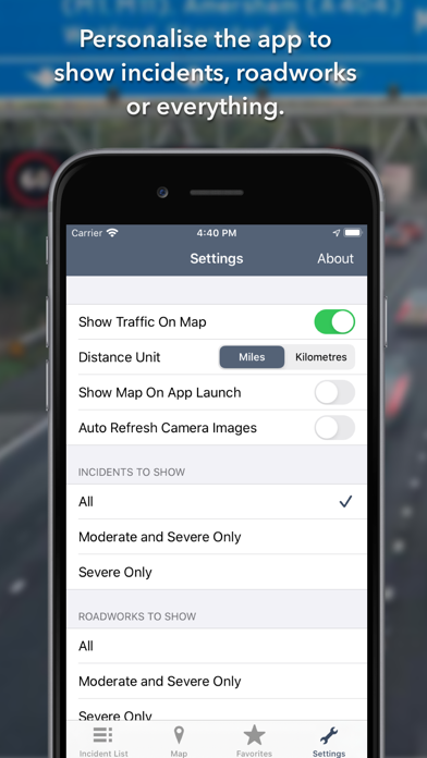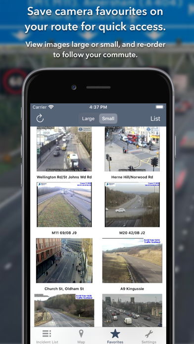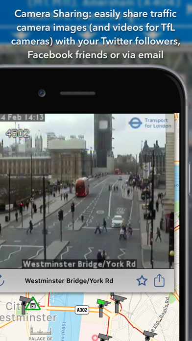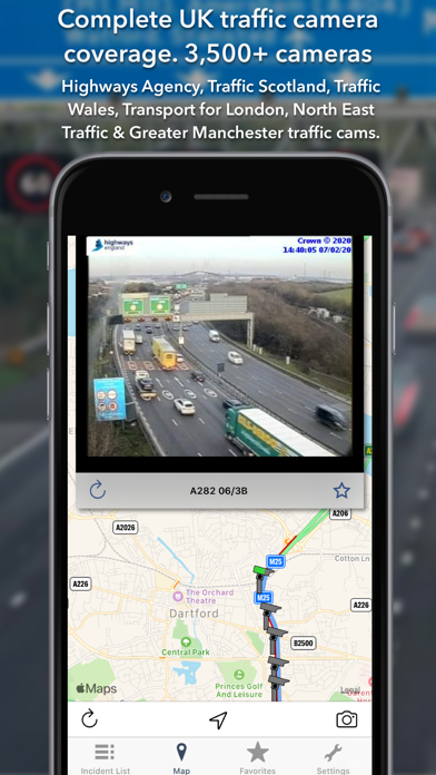 The ONLY app to show live traffic incidents, roadworks and 3,500+ cameras covering England, Scotland and Wales. The 2020 release includes a new dark mode for iOS13. KEY FEATURES Live traffic incidents, roadworks and traffic cams covering: - England: Traffic England for all motorways and main trunk roads: 2,000+ cameras - Scotland: Traffic Scotland: 274 cameras - Wales: Traffic Wales: 197 cameras - London: TfL: 918 VIDEO cameras - Manchester: 45 cameras - Tyne & Wear: 125 cameras - Today screen widget to show at a glance the nearest current traffic incidents - Optimised for all iPhone and iPad models. - Dark Mode throughout the app (iOS13+). - Sharing: you can easily share traffic camera images (and videos for TfL cameras) with your Twitter followers, Facebook friends or via email etc. LIST VIEW - Shows current incidents in order of distance from your current location (closest incidents are shown first). - Each incident is colour-coded to indicate the severity of the delay. - You can quickly see the distance the incident is from you, the road name, the type of incident and when the incident info was updated. - The detail view for each incident shows the description of the incident together with a map showing the exact location of the incident. MAP VIEW - Shows current incidents and traffic cams. - Each incident is colour coded as well as being represented by an icon showing the incident type. - Clicking on an incident displays more detail right there on the map. - The map view can also show live traffic camera images. TRAFFIC CAMS - Toggle show/hide the cameras on the map. - Touch a camera icon on the map to view a live camera image. TRAFFIC CAM FAVOURITES - Save your favourite cameras for quick access to see how clear/congested your usual routes are. TODAY WIDGET - Shows at a glance the nearest current traffic incidents without launching the app. PERSONALISE - Toggle traffic information on the map. - Toggle auto refresh of camera images (will refresh every 10 seconds). - Toggle always show map on app launch. - You can configure which incidents are displayed according to the severity of the delay caused. - Miles or Kilometres setting. ICONS AND COLOUR CODING - The icons on the map show the type of incident so you can see at a glance both the incident type and severity (indicated by the colour of the icon). The incident icons currently available are: - Accident: ambulance icon - Congestion: standard congestion sign (3 cars) icon - Breakdown: car with bonnet raised icon - Signal Failure: traffic signal icon - Event (such as football match, concert): a calendar event icon - Snow or flooding: the appropriate icon - Other/Hazard/Incident: standard hazard (exclamation mark) icon Incidents are colour coded accruing to severity: - Red: severe; delays of one hour or more, or road/exit closed - Orange: medium; delays 15 minutes or more - Green: minor; delays less than 15 minutes CONTACT - Email me for feature requests/bug reports etc. I would love to hear from you! - Follow @ukroadsapp on Twitter for latest news on the app.