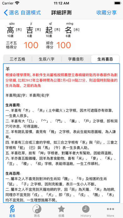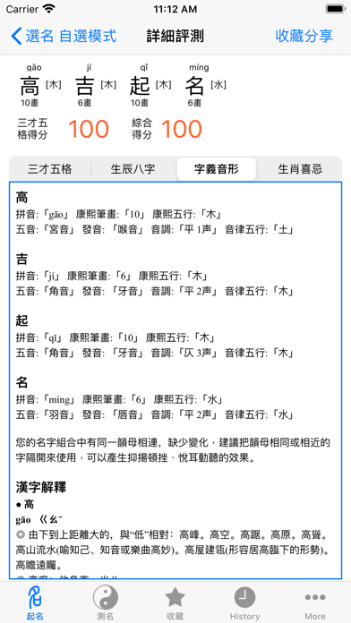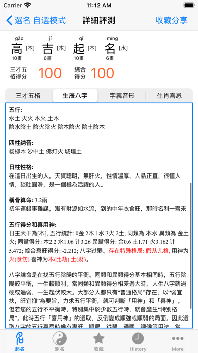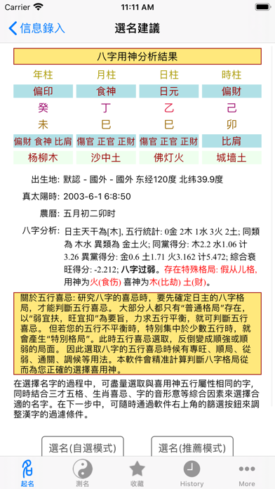 高吉起名是基于中國古代傳統周易理論、命理學及姓名學原理, 綜合生辰八字、三才五格數理、生肖喜忌、五音音律、字形、字意等因素開發而成的專業起名輔助軟件。高吉起名在八字、漢字音形意等方面的研究遙遙領先, 幷根據每個人的特點如生辰、性別、屬相等進行了起名推薦的專門優化。本軟件即可作爲起名軟件,也適合八字命理學研究愛好者以及姓名學理論研究愛好者作爲研 究工具使用。 * 按照命理學原則, 本軟件年的分界點以農曆立春時刻點爲依據, 而不是以春節爲分隔點, 比如2012年立春時間爲公曆2月4日18點22分,則這個時刻點後的生肖爲龍,之前的爲兔, 八字中的年柱也以立春時點爲依據, 比如2012年2月4日18點22分之前爲辛卯年之後爲壬辰年, 月柱以農曆月的節氣具體時刻點爲劃分點,比如2012年驚蟄的時點爲3月5日12點21分,則該時點前的月柱爲壬寅月之後爲癸卯月。在進行八字測算時, 會根據出生地和出生時間等因素進行修正得到出生的真太陽時,以生辰的真太陽時爲八字測算的基準而非出生的鐘錶時間。特此說明。 * 提供自助起名和系統智能推薦兩種起名模式,可以輕鬆取出即適合命理、又音形意俱佳的高分吉祥好名字! * 專業生辰八字、漢字音律、意義、字形等方面的研究, 判別結果精確無誤 * 單姓、複姓,單名、雙名等起名, 全面支持大陸簡體及臺灣、香港、澳門等地區的繁體語言 * 采用經過地理位置及時差因素計算出的真太陽時作爲推算八字基礎, 準確判斷八字格局, 除正格外、能判斷所有特殊格局如曲直格、炎上格、稼穡格、從兒格等等, 在正確判斷命局的基礎上選擇喜用神 * 漢字筆劃及五行屬性以《康熙字典》爲標準,音律五行則參照五音姓名學相關規則制定(如商音屬金、羽音屬水等) * 針對不同性別進行了專門優化, 如女性起名過程中軟件會自動排除含有女性不宜使用的數理漢字, 男性起名也排除了僅適合女性用的漢字 * 自選模式下, 提供完全的篩選功能, 可指定漢字五行屬性來匹配喜用神, 也可指定用字, 比如滿足家族族譜指定用字的需要, 也可排除你不喜歡的一些漢字, 同時提供生肖喜忌的用字選擇 * 推薦模式下,一鍵輕鬆生成超多高分吉名!所有結果均可到各大測名網站進行驗證 * 提供全面的測名功能,包括三才五格剖象詳細說明、生辰八字解讀、字意音形剖析、生肖喜忌說明等內容 * 提供好名收藏功能, 起名過程發現好的名字需要後續比較, 簡單一鍵加入收藏夾, 可供隨時查閱