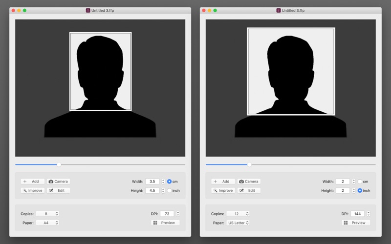 Easily create photos for your documents (identity card, passport). Features: - drag and drop or import an existing photo; - take a photo with the built-in iSight camera; - automatically improve the quality of the image; - edit many parameters of the image (exposure, contrast, saturation, temperature, tint, sharpness); - for optimum sizing of the photo, you can use the zoom in/out function; - set your custom photo size (cm/inches); - set your custom resolution (DPI) and generate a preview in pdf format; - print from 1 to 12 copies (single/multiple page); - print in A4, A5, A6, US Letter, US Legal, 4 x 6 inches, 5 x 7 inches, 6 x 8 inches, 8 x 10 inches.