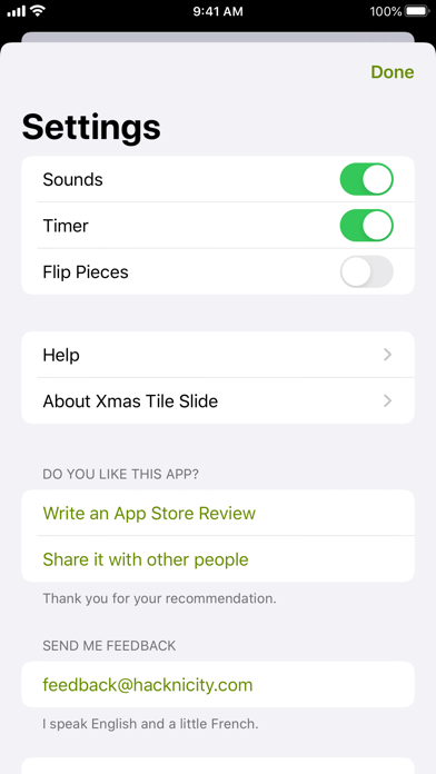 Race against the clock to complete a festive sliding tile puzzle. • Four difficulty levels/puzzle sizes, suitable for all ages and skill levels (larger sizes require an in-app purchase). • Play with classic numbered tiles, choose from 16 Christmas images, or use images from your camera/photo library. • For an extra challenge, enable the Flip Pieces setting so pieces can be flipped over. • Turn off the timer for a more leisurely game!