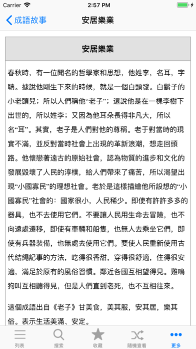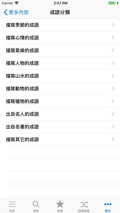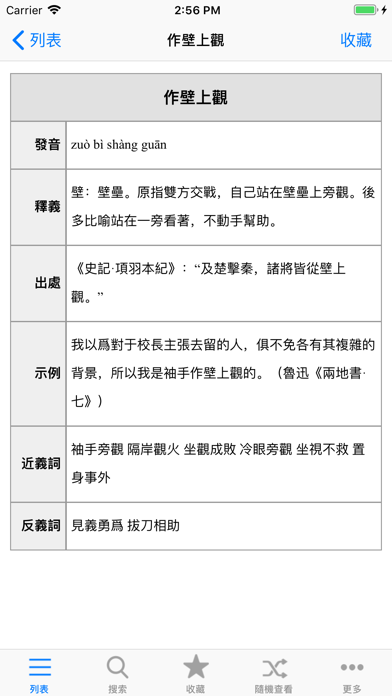 成语大全经典全集,收录了近四万条成语以及近千条经典成语故事, 同时提供了分类浏览模式, 比如可以按描写季节、心情、天气、人物,出自名人、名著等方式来查看成语。每条成语包含了发音、释义、出处、示例、近义词、反义词等详细内容,使用操作方便简洁,强大的查询服务提供模糊查找、指定位置查找等, 离线内容一次下载之后不再消耗网络流量,是一款不可多得的学习与了解成语的工具。