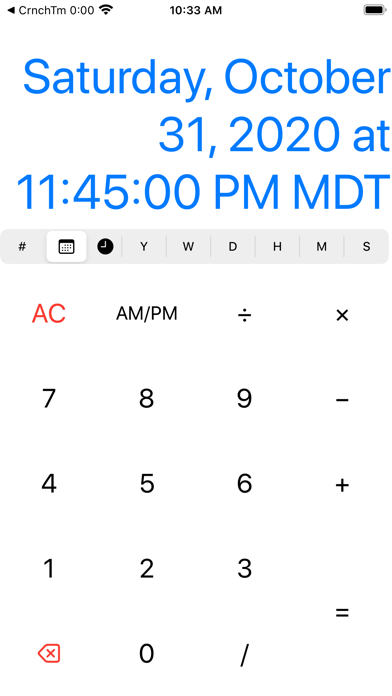 Really cool Time & Date calculator which converts between units easily. * CALCULATE using dates, times, years, days, hours, minutes, & seconds. * CONVERT between all above units. * Includes MULTIPLICATION, SUBTRACTION, ADDITION, & DIVISION. * Simple design - very powerful functionality * EASILY & RAPIDLY INPUT dates, times, or both * Perform calculations in the units of your choice, then convert the answer to any other unit * Track how long until an event or how long since one occurred Examples: - If I ran a 5k in 20:09, then what was my pace?: 20:09 ÷ 3.1 = 6:30. - What if I took about 7 seconds off my pace, then how long would it take to complete my workout?: 6:30 - 7 = 6:23 × 3.1 = 19:48. - If I do 30 second reps 12 times, how much total time did it take?: 35 seconds × 12 = 7m 00s. - How many minutes is 8 hours? - Exactly old is someone born on 4/8/1985? - How many seconds? - How long has it been since we first met? - When is 6 weeks from today? - How many seconds in 30 years? - How many days is 1,000,000 seconds? - What about hours? Answer these, and other time-related questions! Crunch Time. Please feel free to contact us at support@alumra.ltd with any questions or feedback. As always, we'd love to hear from you!