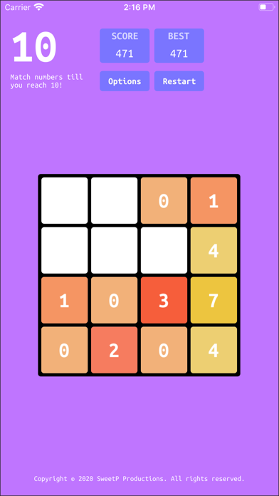 Match numbers till you reach 10! based on the wildly popular 2048 game. 1010 is super easy, and quick to learn! -perfect for killing time waiting for the bus, or train. -sitting in a boring meeting.... no problem - fire up 1010! -run out of small talk on that hot date..... challenge your beau to a little 1010 action GAMEPLAY: Move the tiles on the board with your fingers. Similar tile numbers combine when they touch. For example, when two 4's combine they form a 5, two 5's form a 6, and so on. Get to the 10 tile to win!