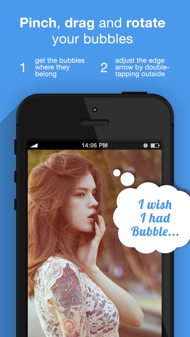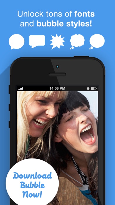 ADD SPEECH BUBBLES TO YOUR PHOTOS! Bring everyone's thoughts and words to life with Bubble. Bubble allows you to create comic style captions of whatever text you like and place them on your photos of friends. PINCH, DRAG, ROTATE, ADJUST, AND MUCH MORE. The flexibility of Bubble is limitless. Use different bubble styles such as thought, cloud, block or shock. Change the font and the color of your text. Add multiple bubbles to group photos. Share your creations with family and friends. FEATURES - Bubble creation interface where you add your text to any photo - A vast selection of fonts, colors and bubble styles to choose from - Pinch, Drag, Rotate and Arrow adjustment technology to get your bubbles where you want them - Share your creations to Facebook, Instagram or Twitter - or send them over Email and Text message - Edit your photos at any time from the gallery
