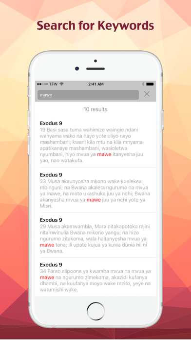 The Holy Bible in Swahili and English Fully Loaded with all features that will make this app easier to read Highlighting Notes taking Underline text Web-search Dictionaries Copy and paste Night and Day mode Text searching Two bundle Bible Fantastic Font size suited for all people with long or short sightedness. READ THE BIBLE 1. Easily select from two different languages Swahili and English instantly. 2. The Bible versions are available offline, no internet is required after installation and its so easy to read. 3 . Full text search with result highlighting and bookmarking. 4 . Write and save personal notes 5 . Read easily with settings like font size and text size. 6. Social sharing with friends via Facebook, twitter or email. God Bless you All