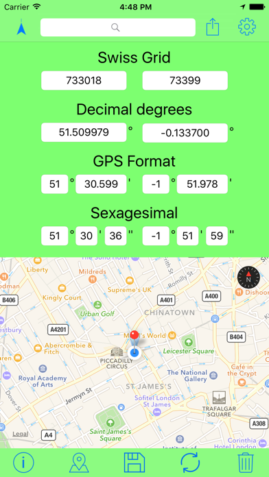 Swiss Grid Coordinates Tool is a great tool to convert your coordinates into different formats. You can convert your coordinates into 4 formats: - Swiss Grid - Decimal degrees (DDD.DDDDDD°) - GPS Format (DDD° MM.MMM′) - Sexagesimal (DDD° MM′ SS″) Extra functions: - You can locate yourself and convert these coordinates. - You can set a pin or move a pin and it shows you the coordinates of the pin. - You can see the distance between you and the coordinates or between you and the pin. - You can search for locations. - You can share and send your coordinates. - You can display the coordinates (or your location) on the maps app. - You can save and load coordinates to use them later. - You can hide the map to save battery and mobile data.